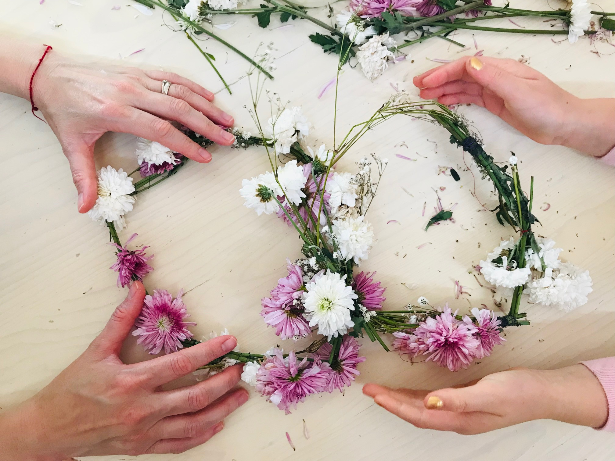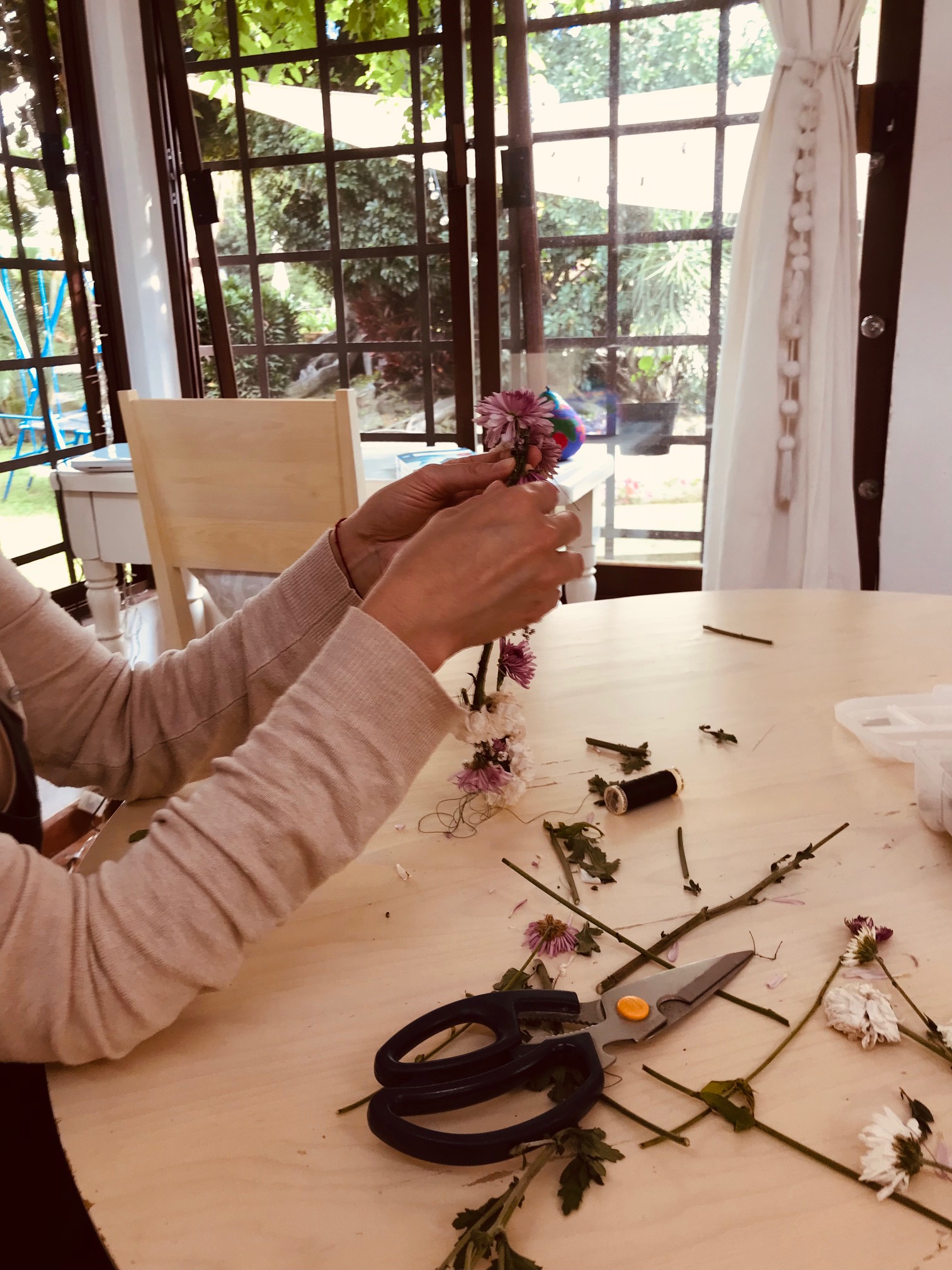 Escoges una rama con flores y lo vas entrelazando una con otra, con el hilo le haces un nudo, y así consecutivamente, hasta llegar a un tamaño que consideres te quede en tu cabeza.