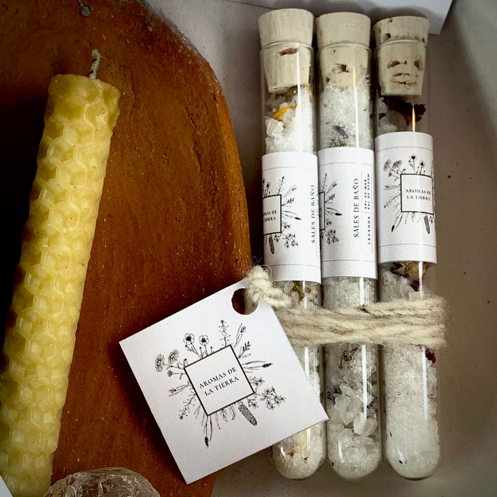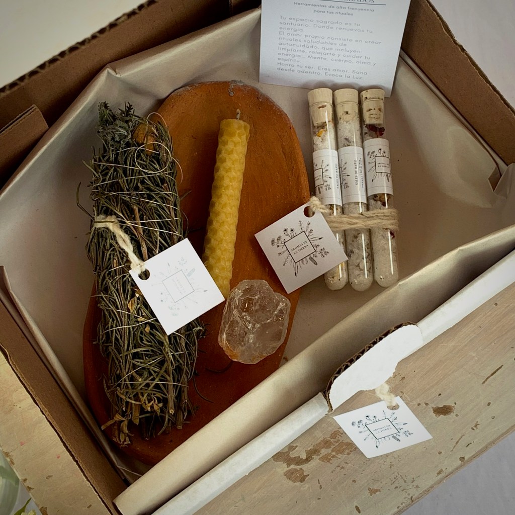 Un plato de barro hecho por la artesana Agapita Estrada Olivares. Ella es originaria de la comunidad indígena de Cuentepec, municipio de Temixco, Morelos. Contiene una vela pequeña de cera de abeja. Hay un cuarzo blanco y un atadito de hierbas para sahumear o hacerte un baño. Incluye 3 pebeteros con sales de baño y mezcla de flores.