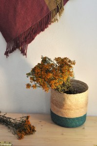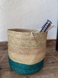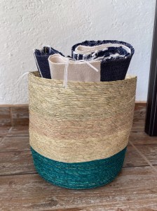 Cesta sobre luz, color y forma, que sirve para muchos usos, colocar en distintas partes de tu hogar, con una serie de objetivos como guardar juguetes, toallas, mantelería, para una maceta. Con un tamaño de 26 cm de altura x 26 cm de ancho. Cesta de palma con una combinación de verde agua con crudo, hecho en Tepoztlán, Morelos.