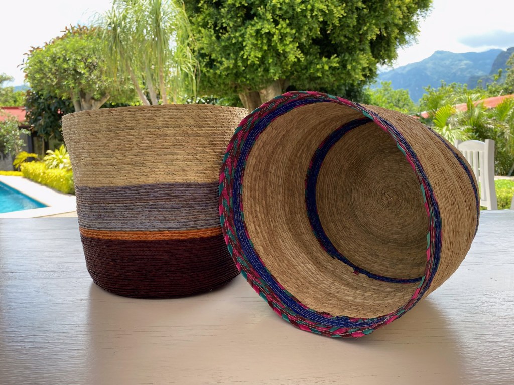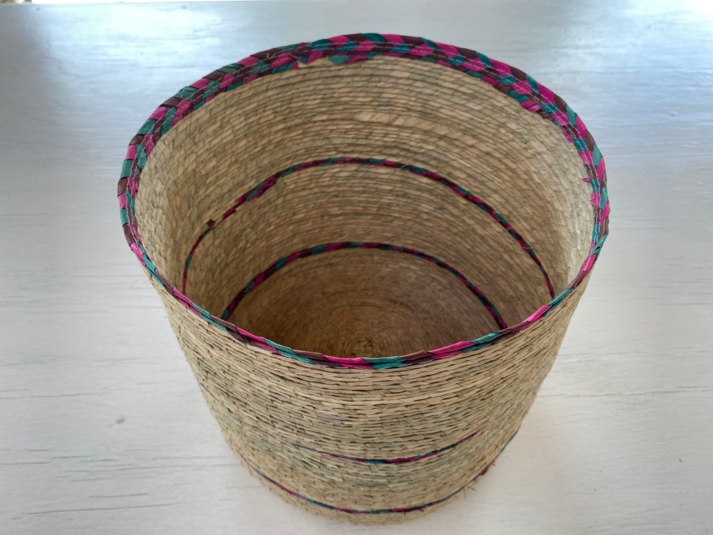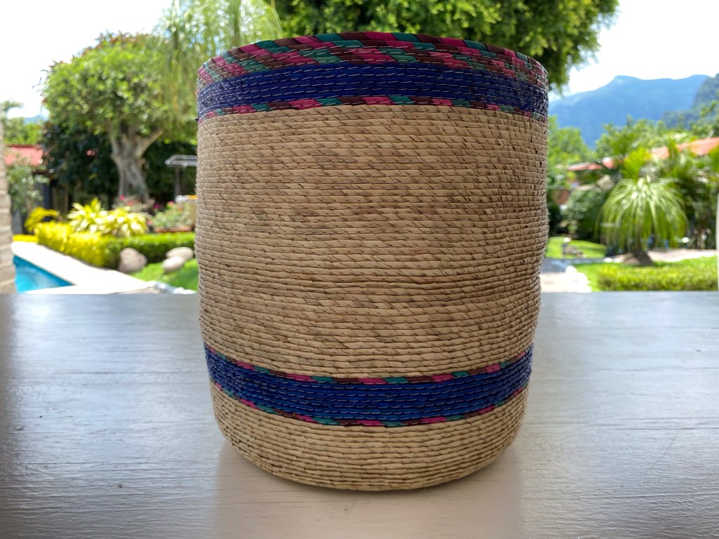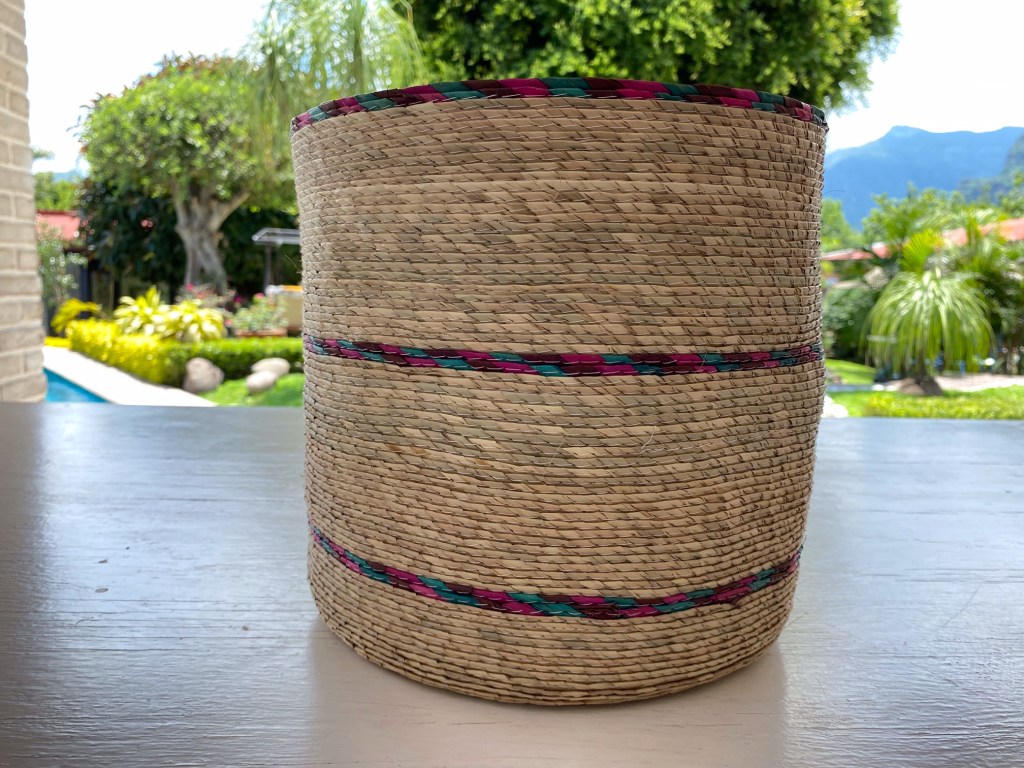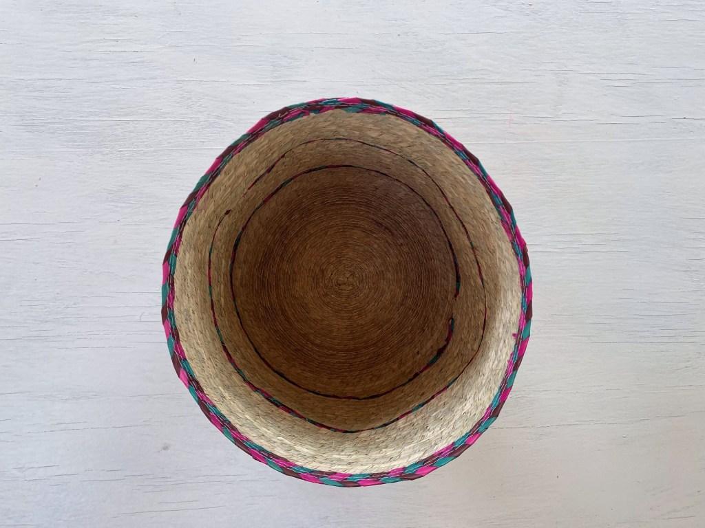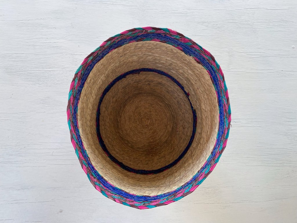 Cesta sobre luz, color y forma, que sirve para muchos usos, colocar en distintas partes de tu hogar, con una serie de objetivos como guardar juguetes, toallas, para una maceta, decoración. Con un tamaño de 23 1/2 cm de altura x 26 cm de ancho. Cesta de palma cruda con tres tiras de colores: morado, rosa y verde agua. Hecho en Tepoztlán, México.