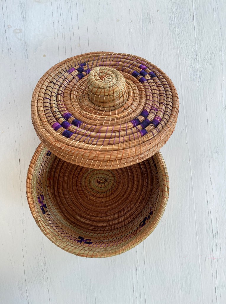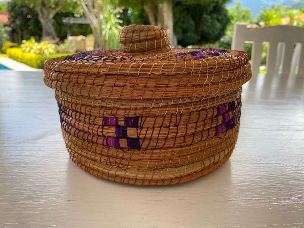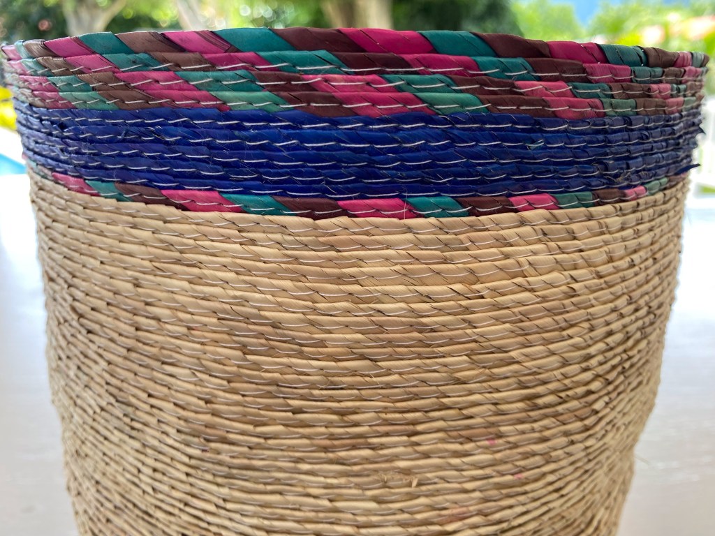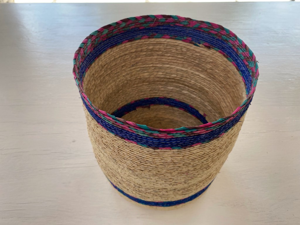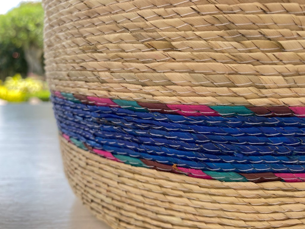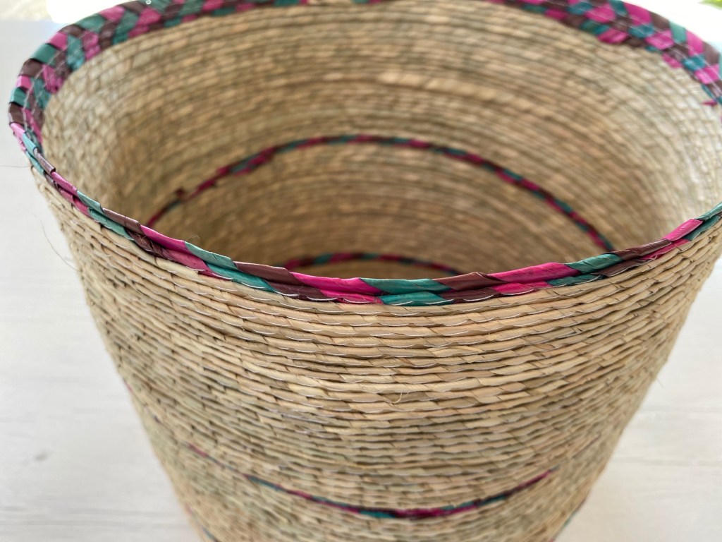 Cesta sobre luz, color y forma, que sirve para muchos usos, colocar en distintas partes de tu hogar, con una serie de objetivos como guardar juguetes, toallas, para una maceta, decoración. Con un tamaño de 23 1/2 cm de altura x 26 cm de ancho. Cesta de palma cruda con tres tiras de colores: morado, rosa y verde agua. Hecho en Tepoztlán, México.