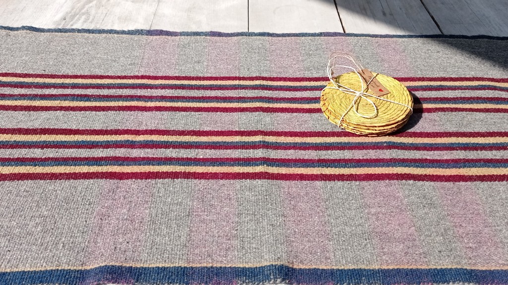 Materiales: hilo de lana, hilo teñido con las hojas y frutos del nogal, de la flor de pericón y de la grana cochinilla.
