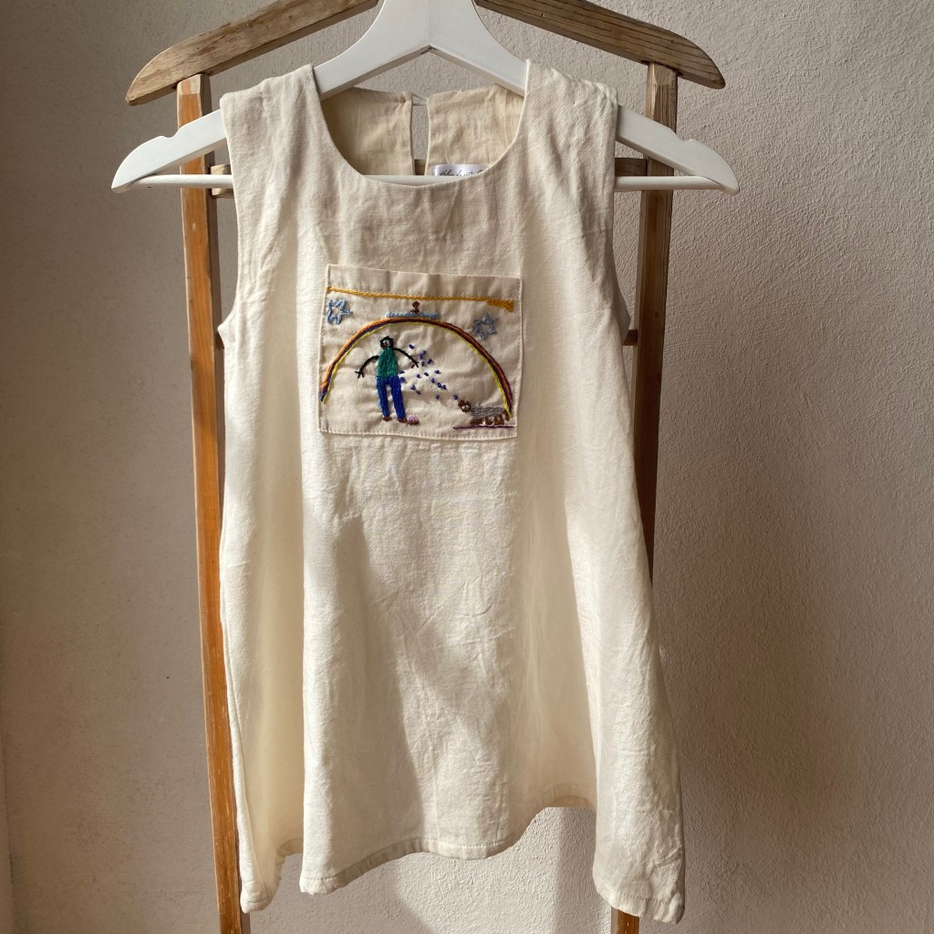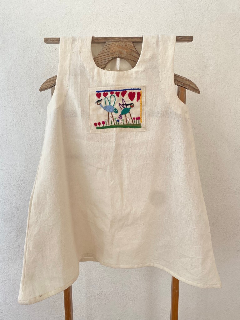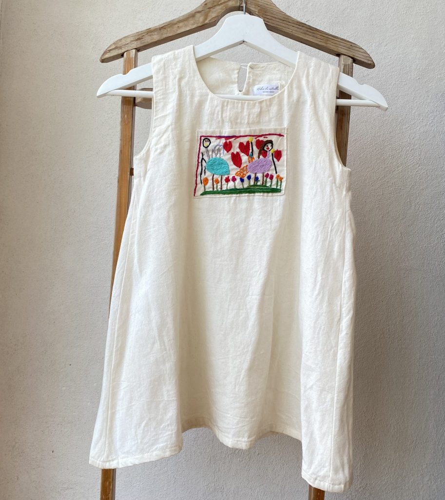 Vestido para la infancia bordado a mano a partir de dibujos realizados en la niñez.