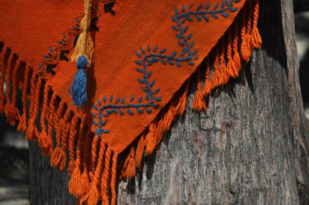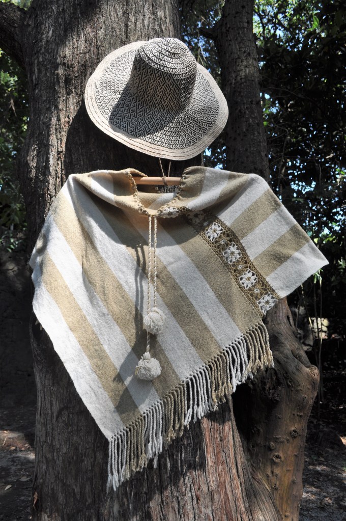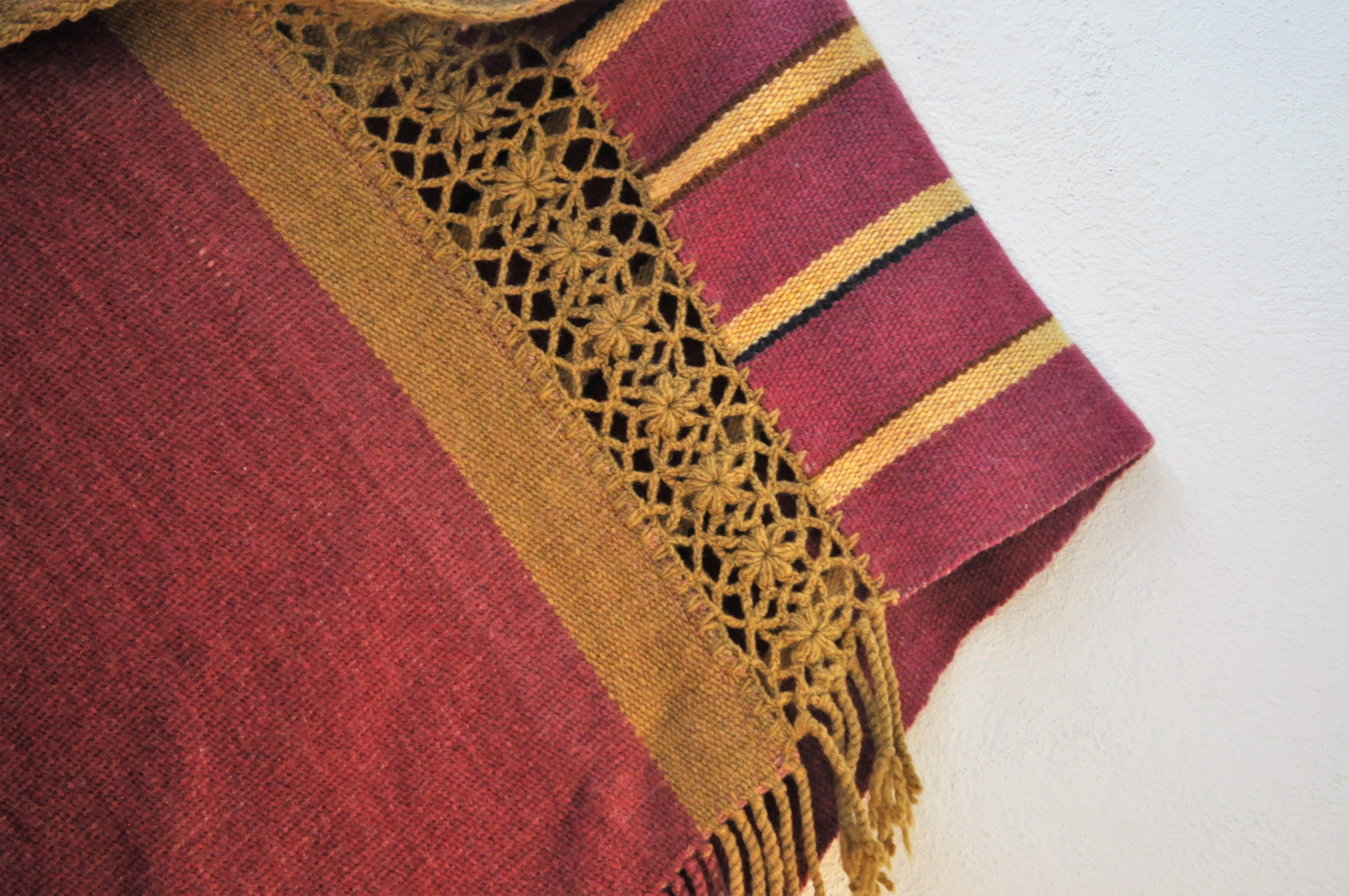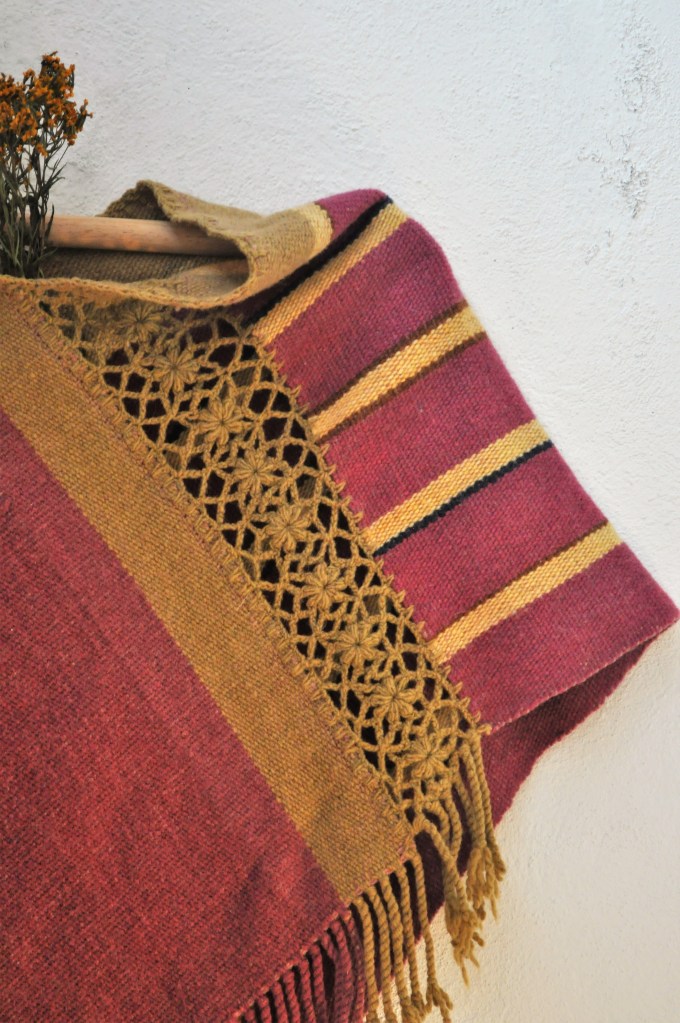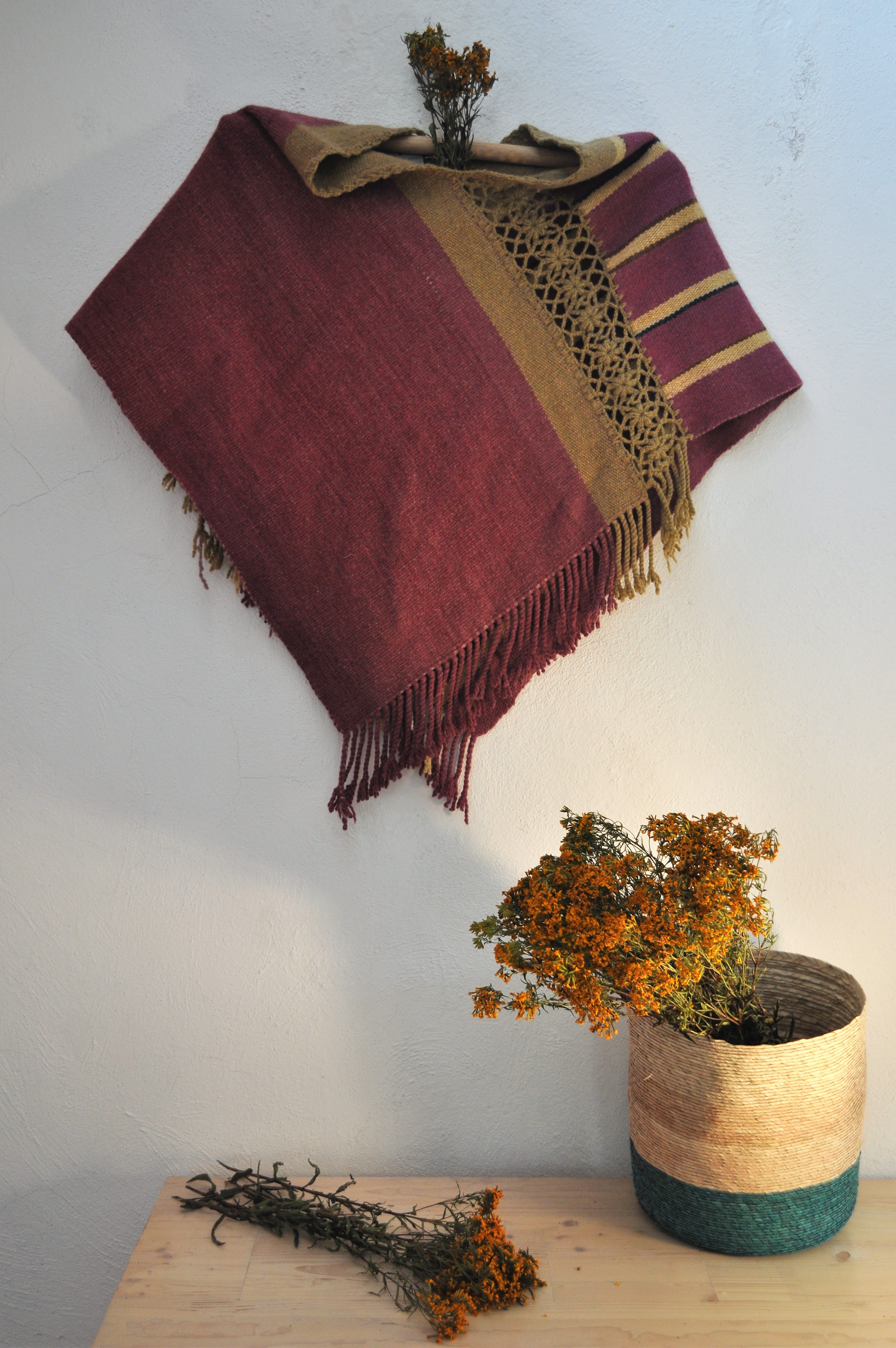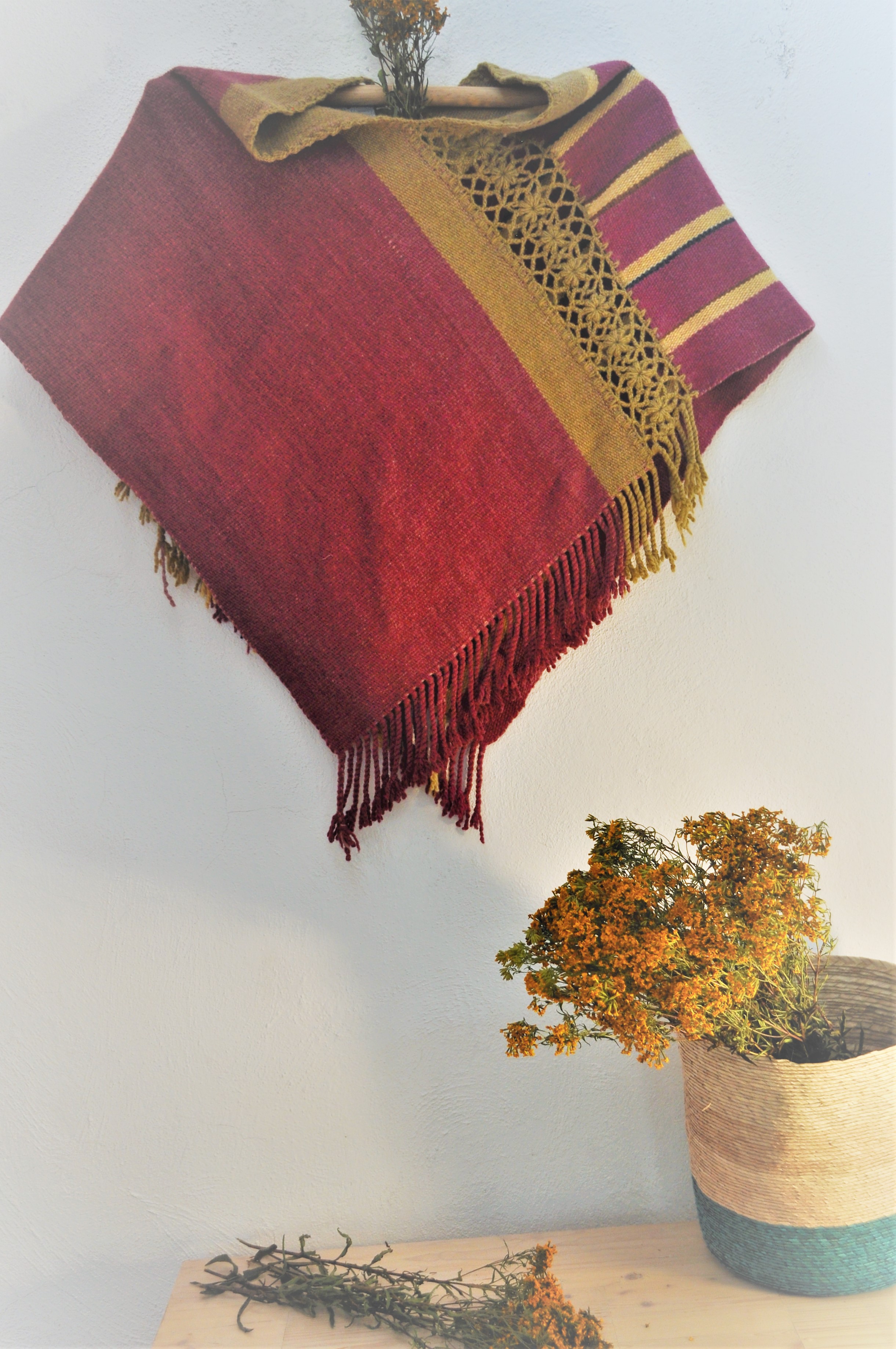 Material: Lana natural, delgada e hilos teñidos de manera natural con flores y plantas del campo, tales como el negro del nogal