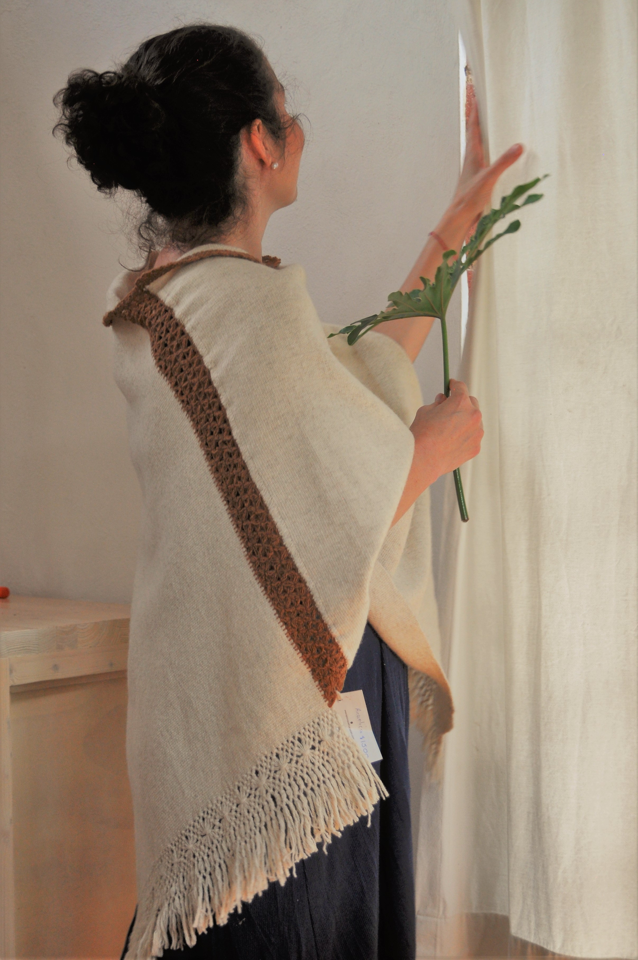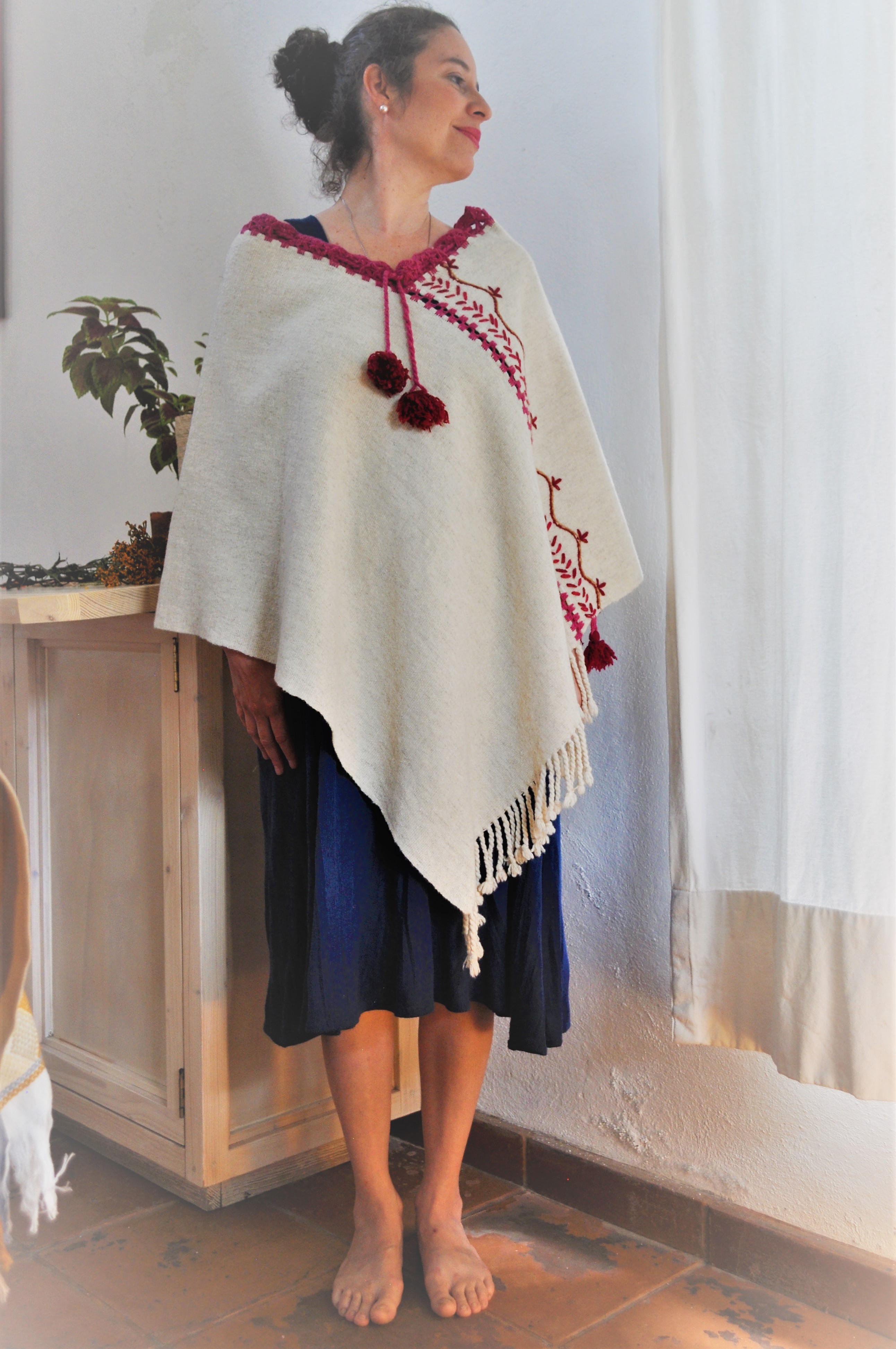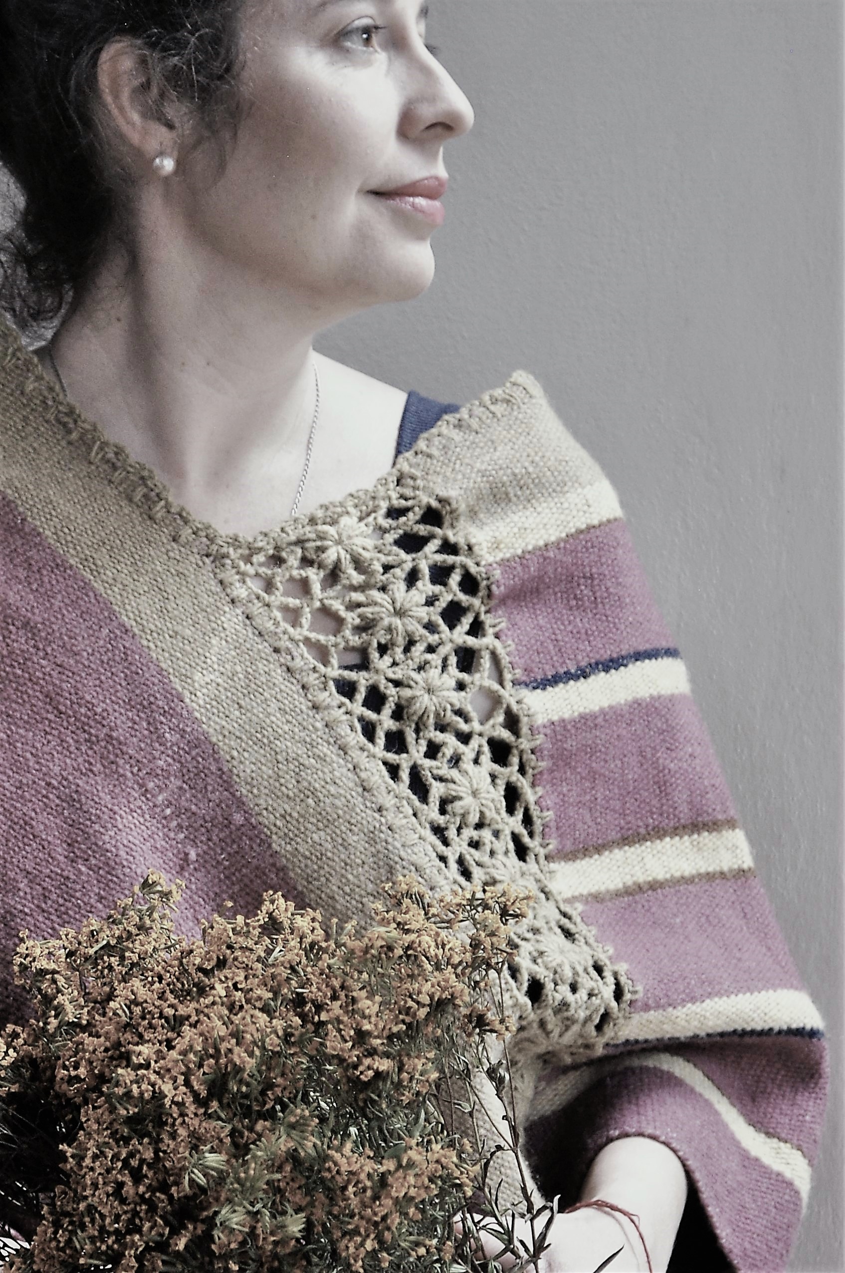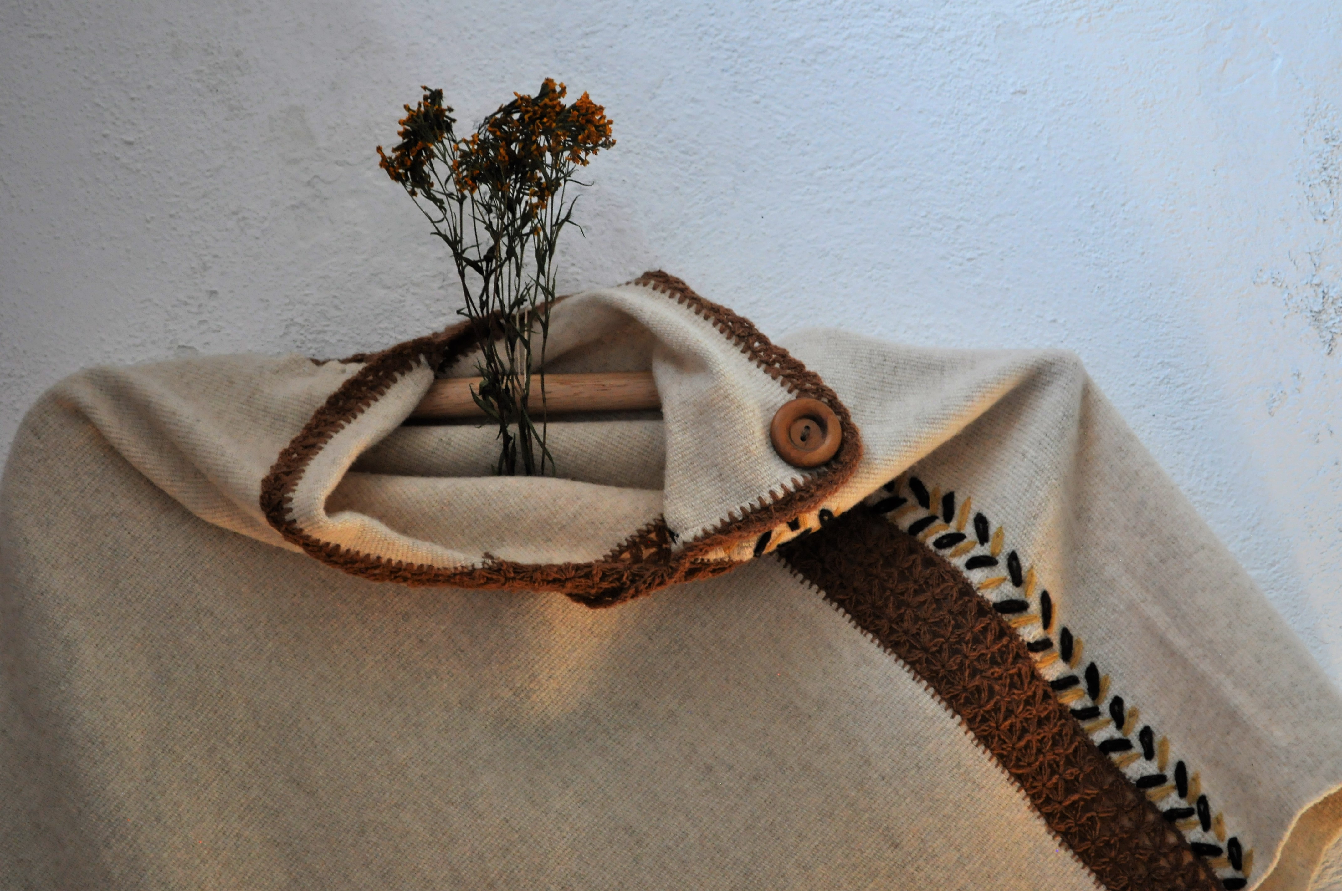 Material: Lana natural, delgada e hilos teñidos de manera natural con flores y plantas del campo, tales como el negro del nogal