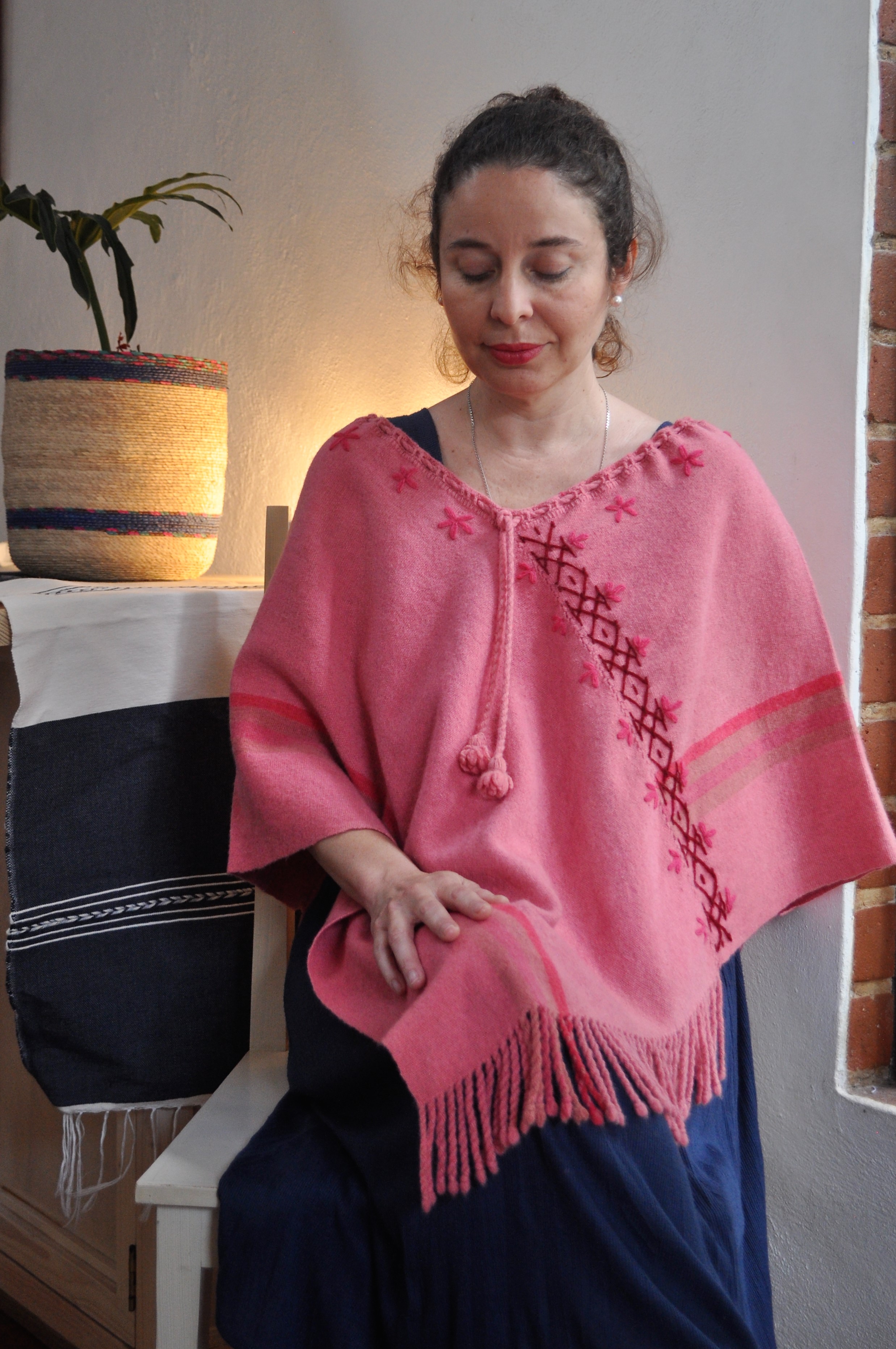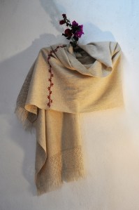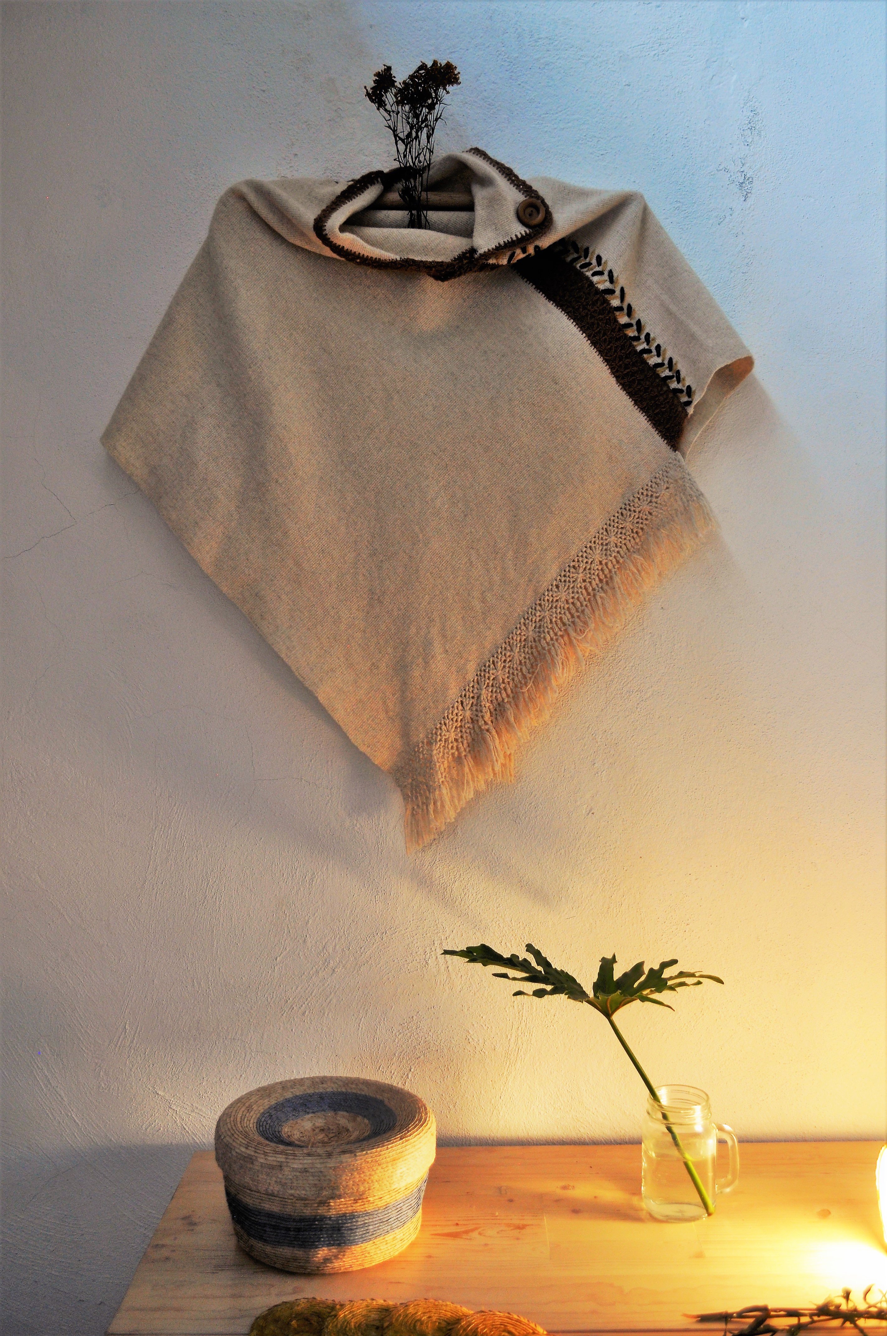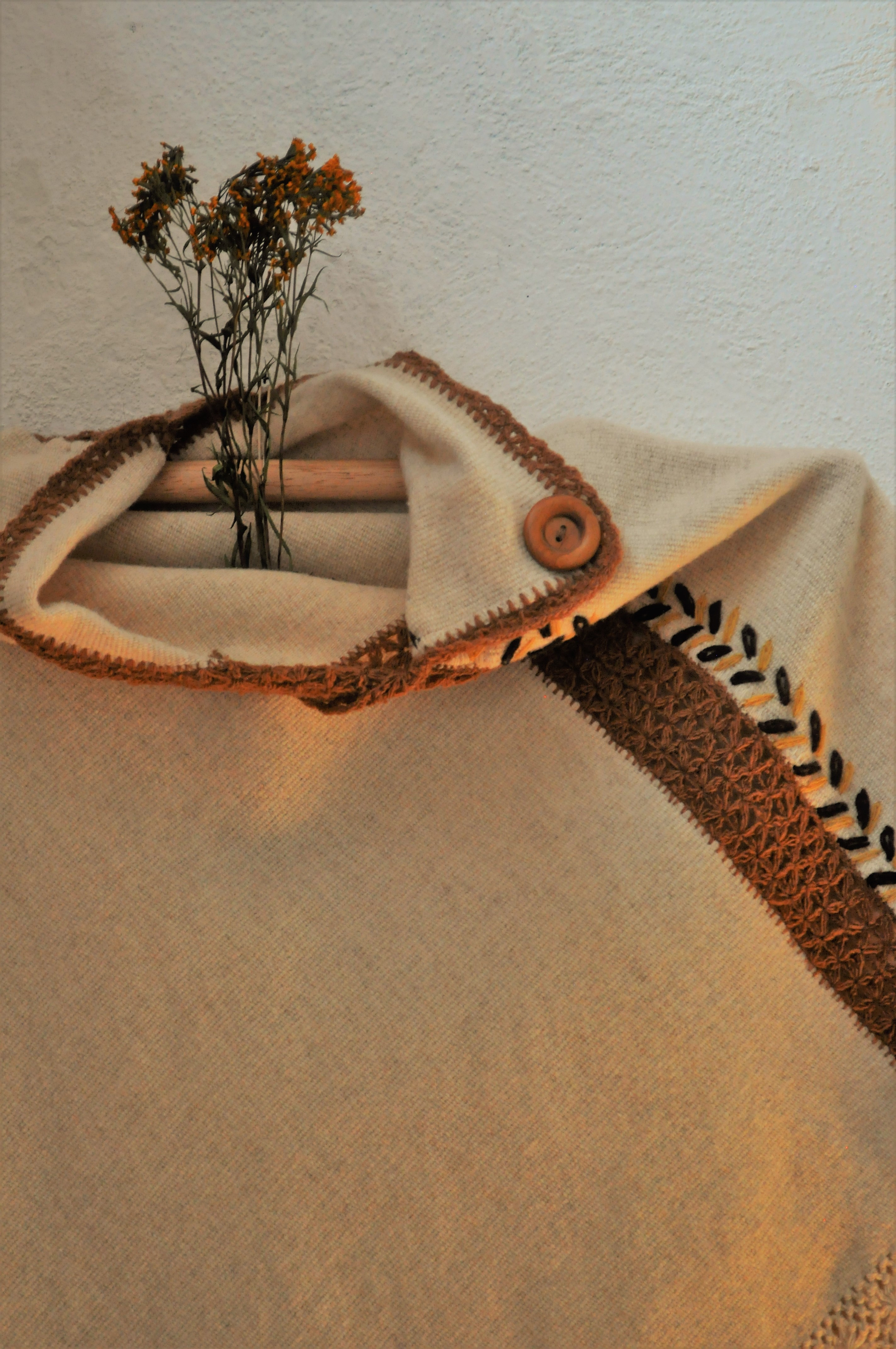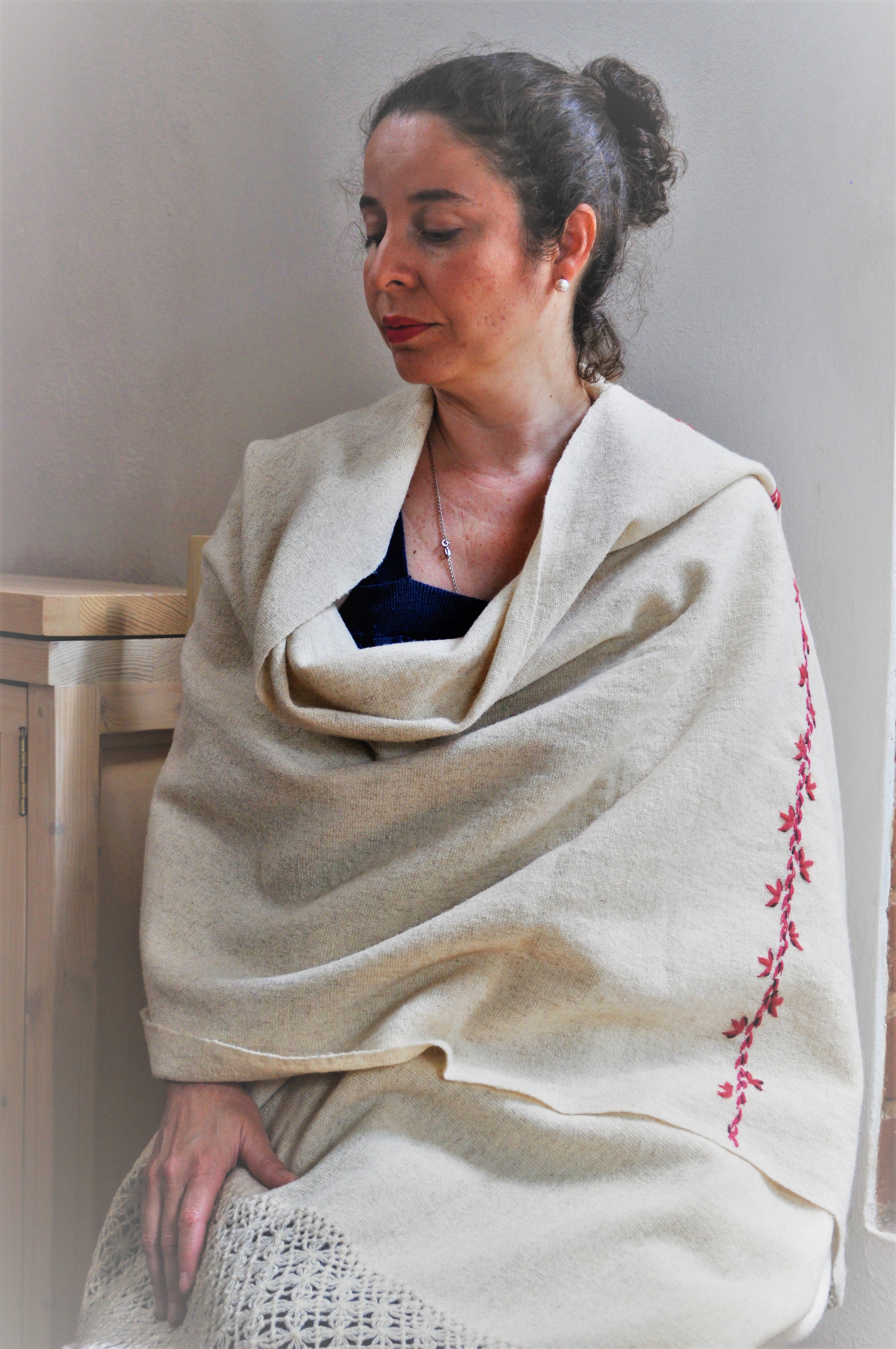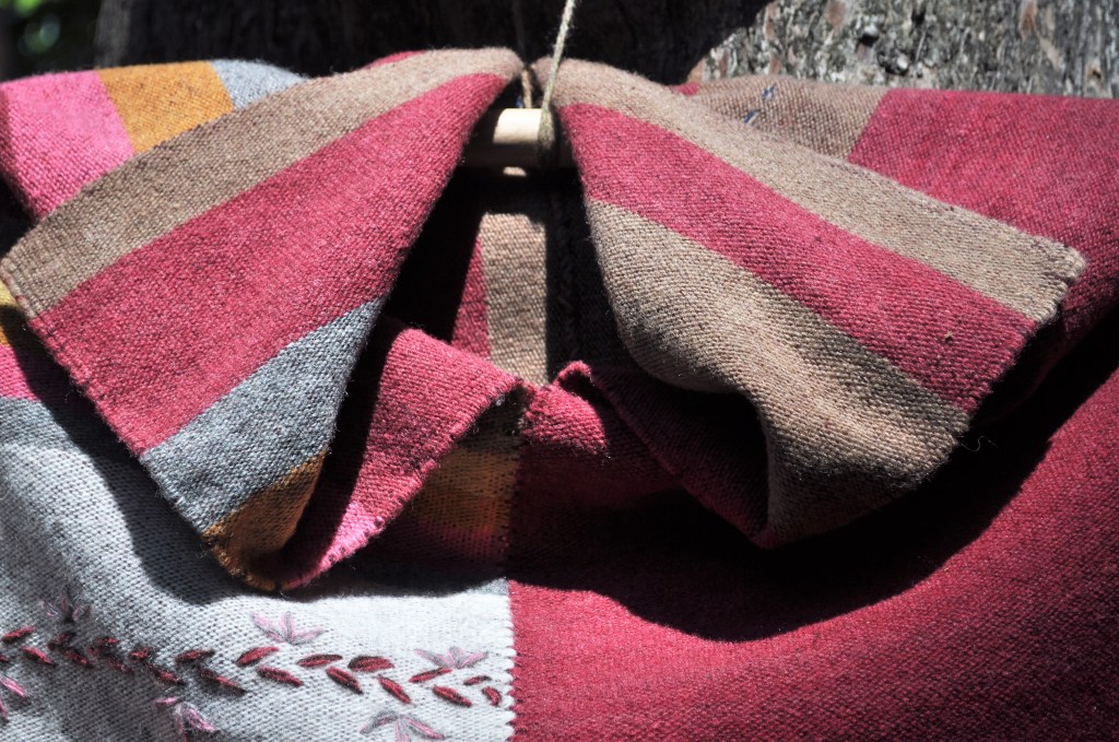 Material: Lana natural, delgada e hilos teñidos de manera natural con flores y plantas del campo, tales como el negro del nogal