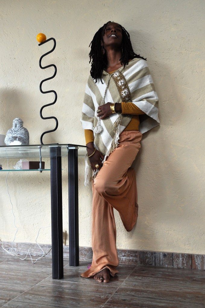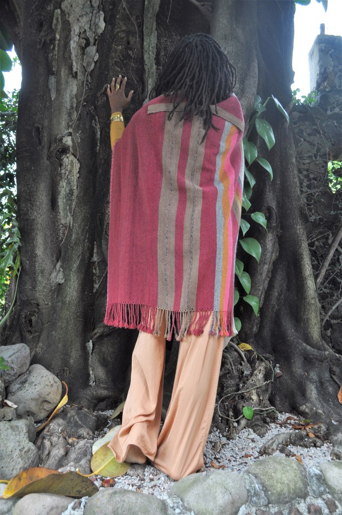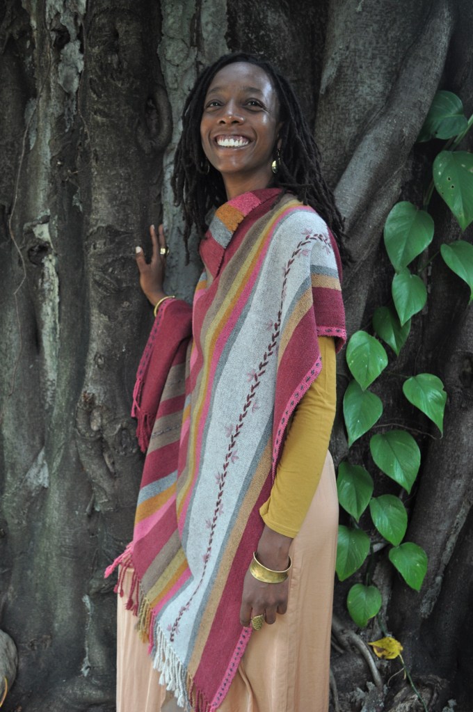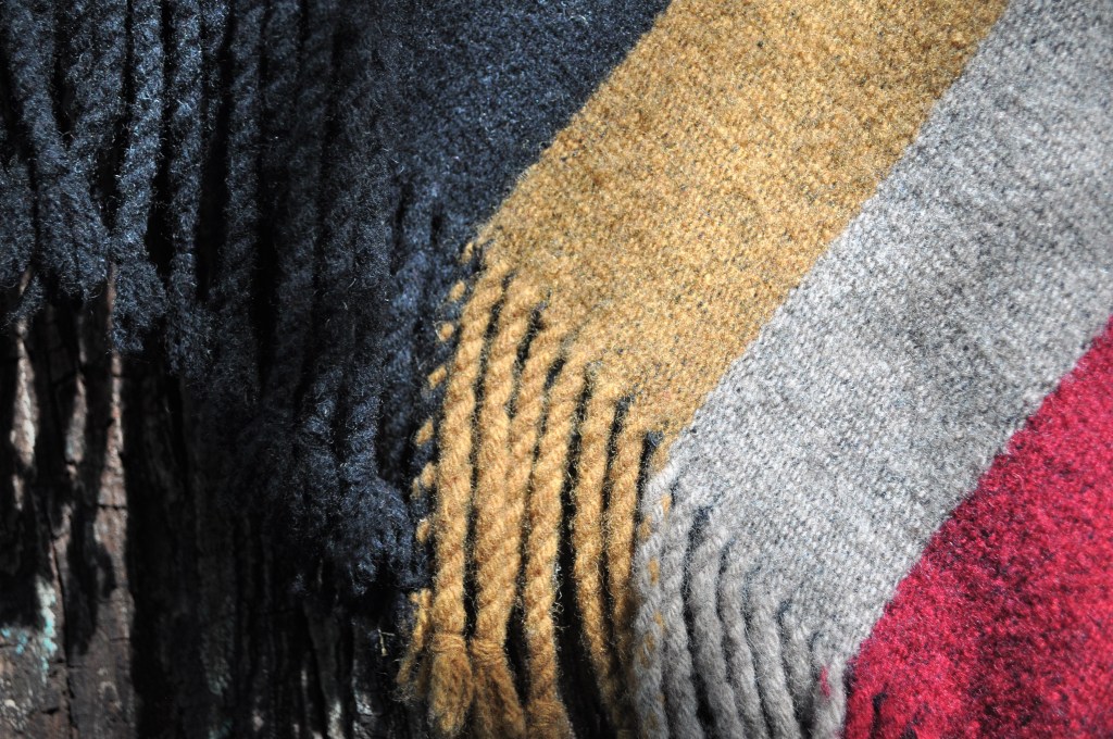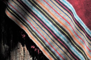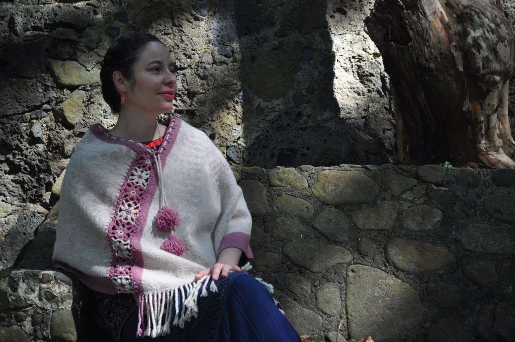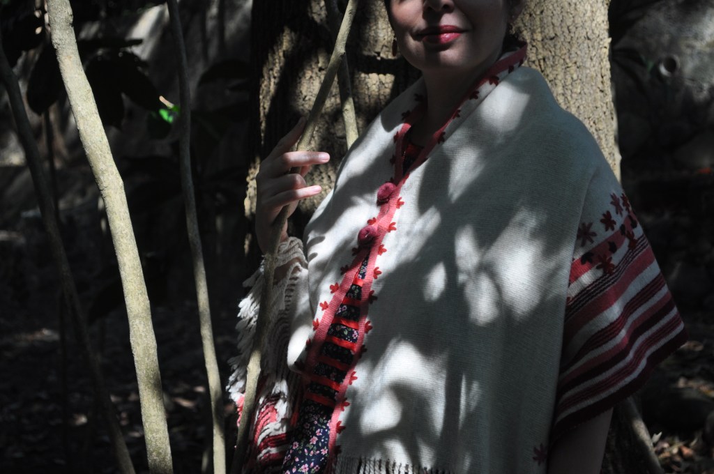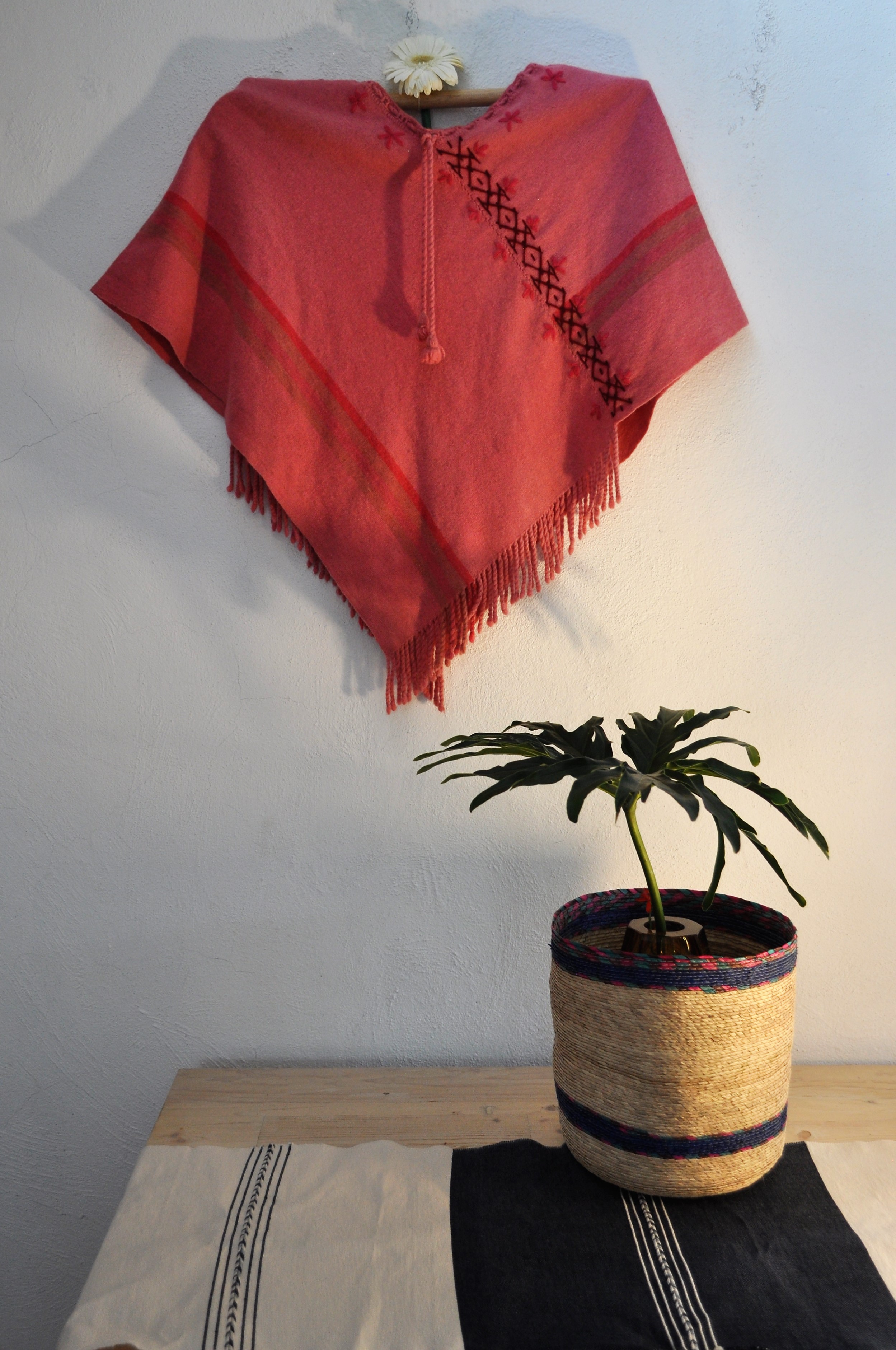 Material: Lana natural, delgada e hilos teñidos de manera natural con flores y plantas del campo, tales como el negro del nogal