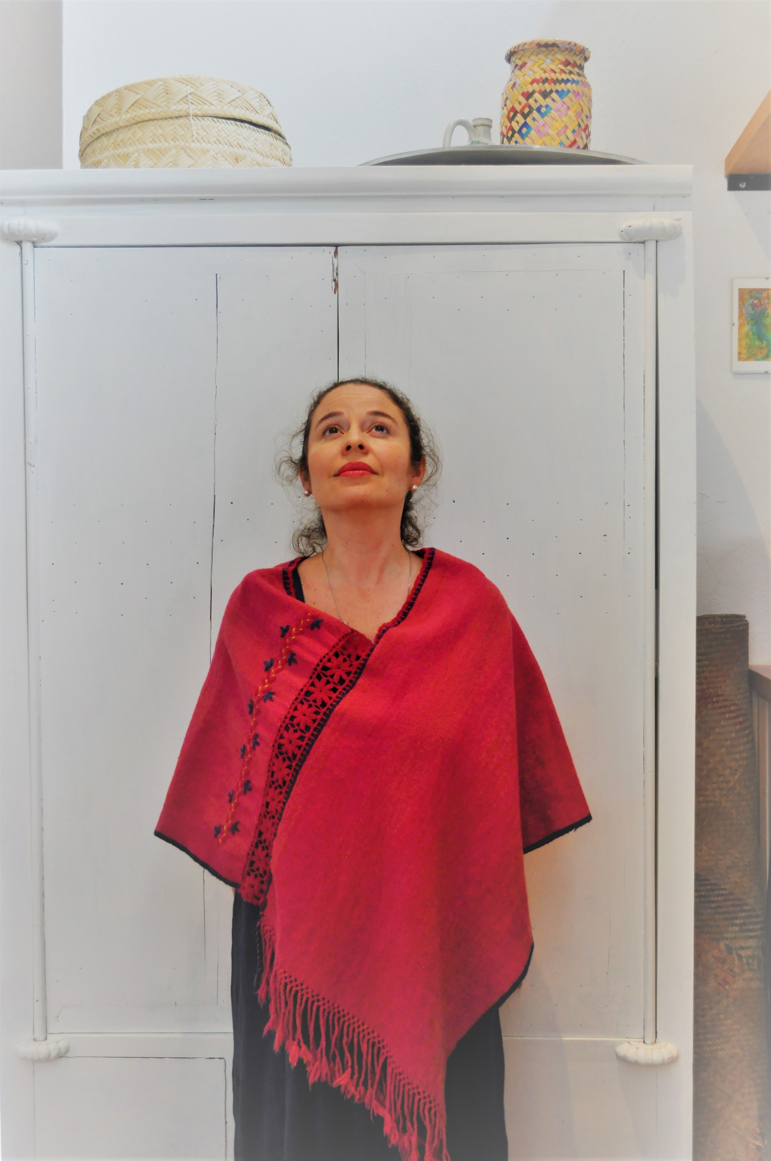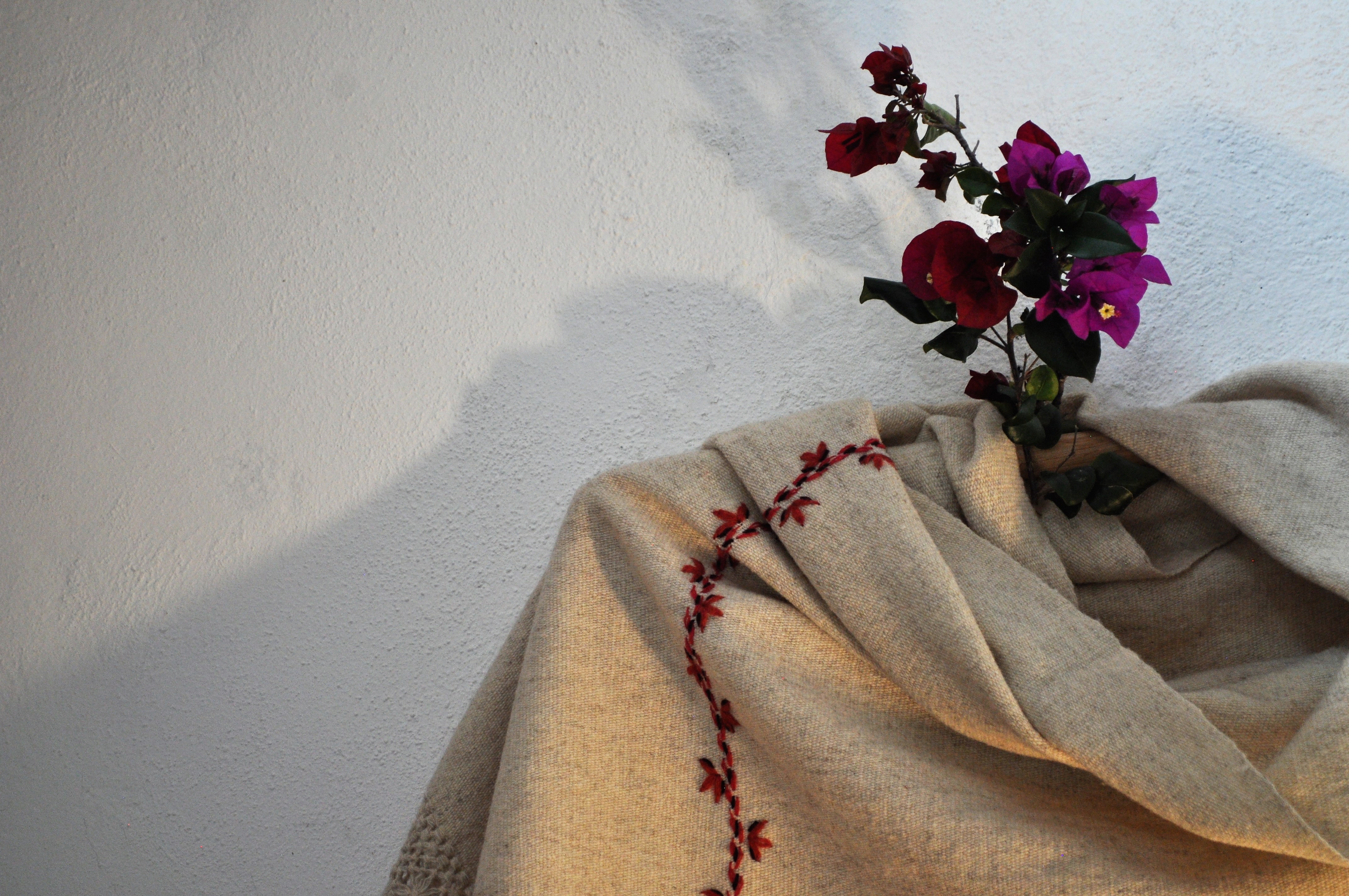 Color: Blanco natural y detalles en distintos tonos cálidos de rojo de la grana cochinilla.