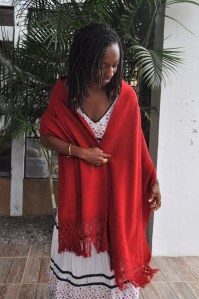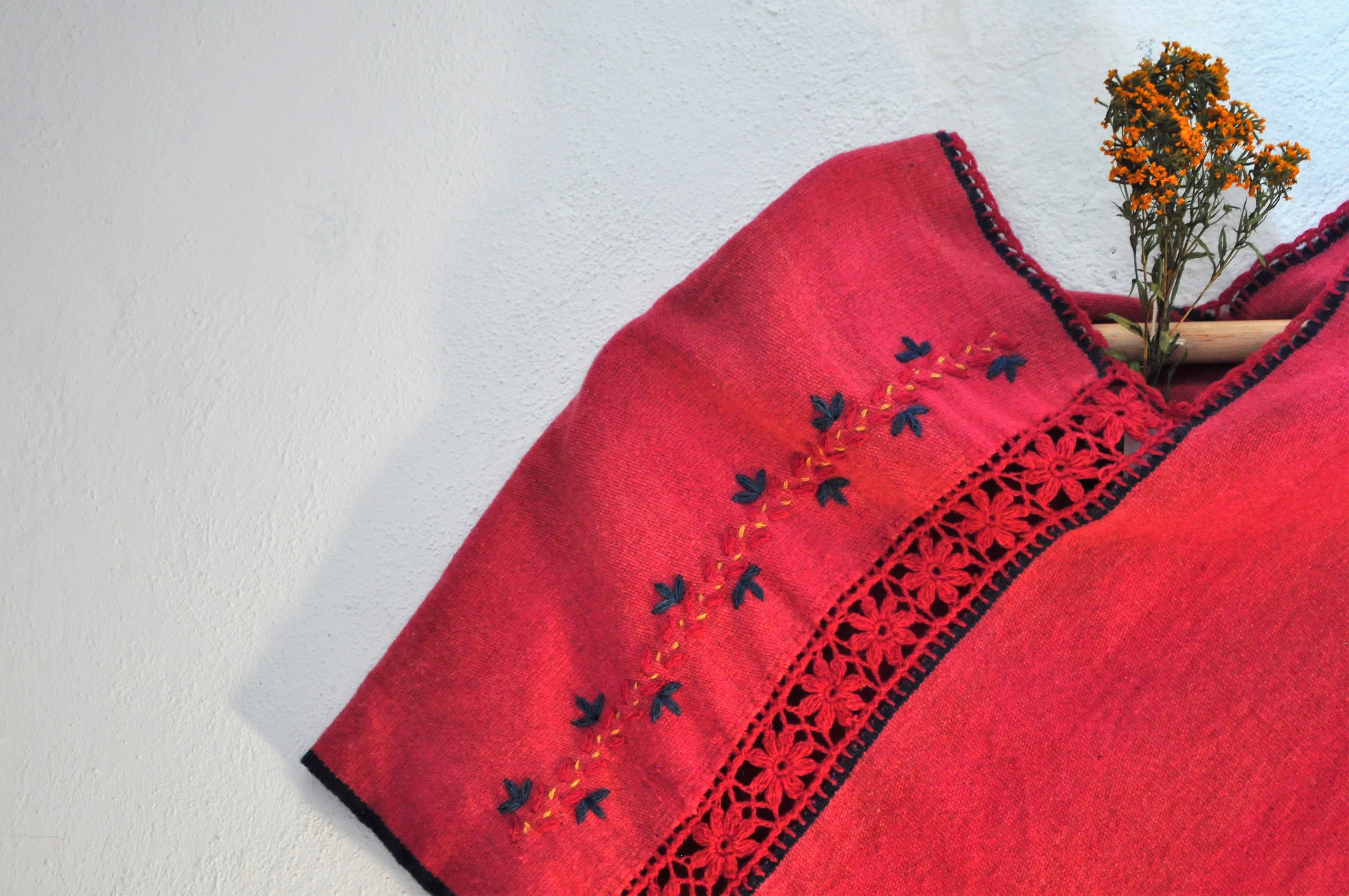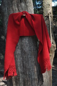 Material: Lana natural, hilo teñido con la grana cochinilla