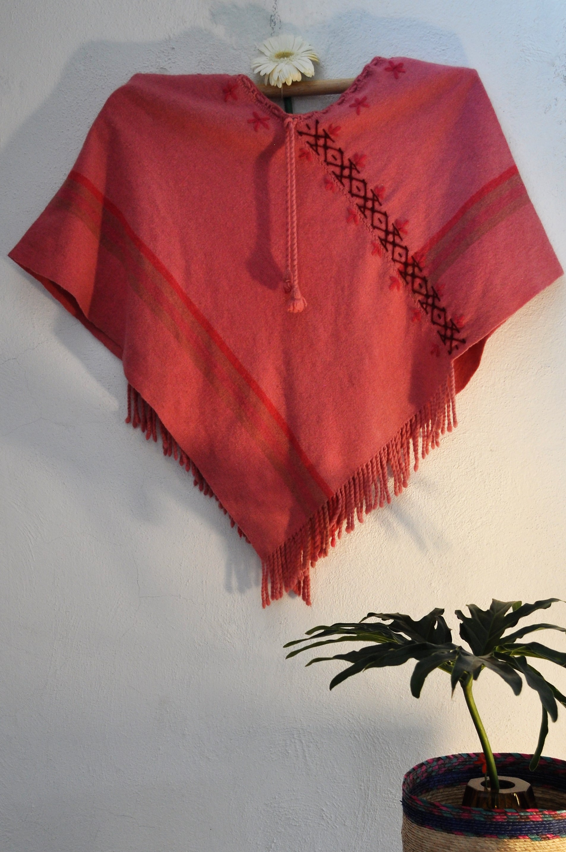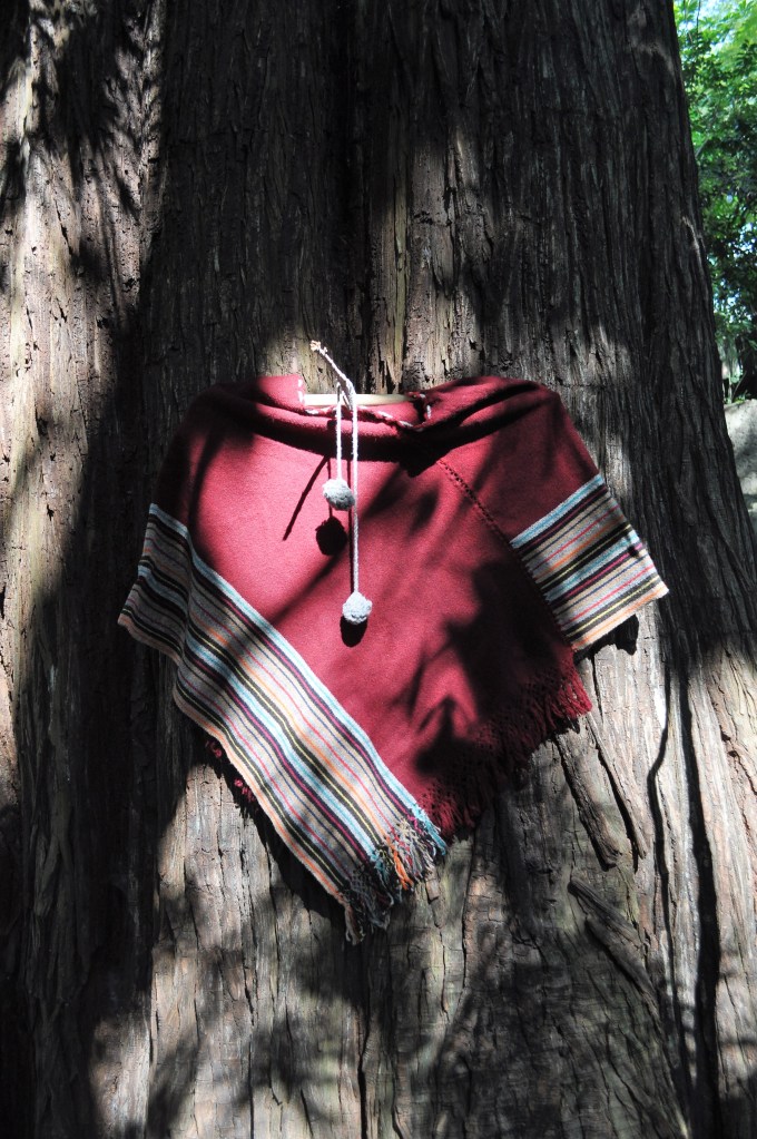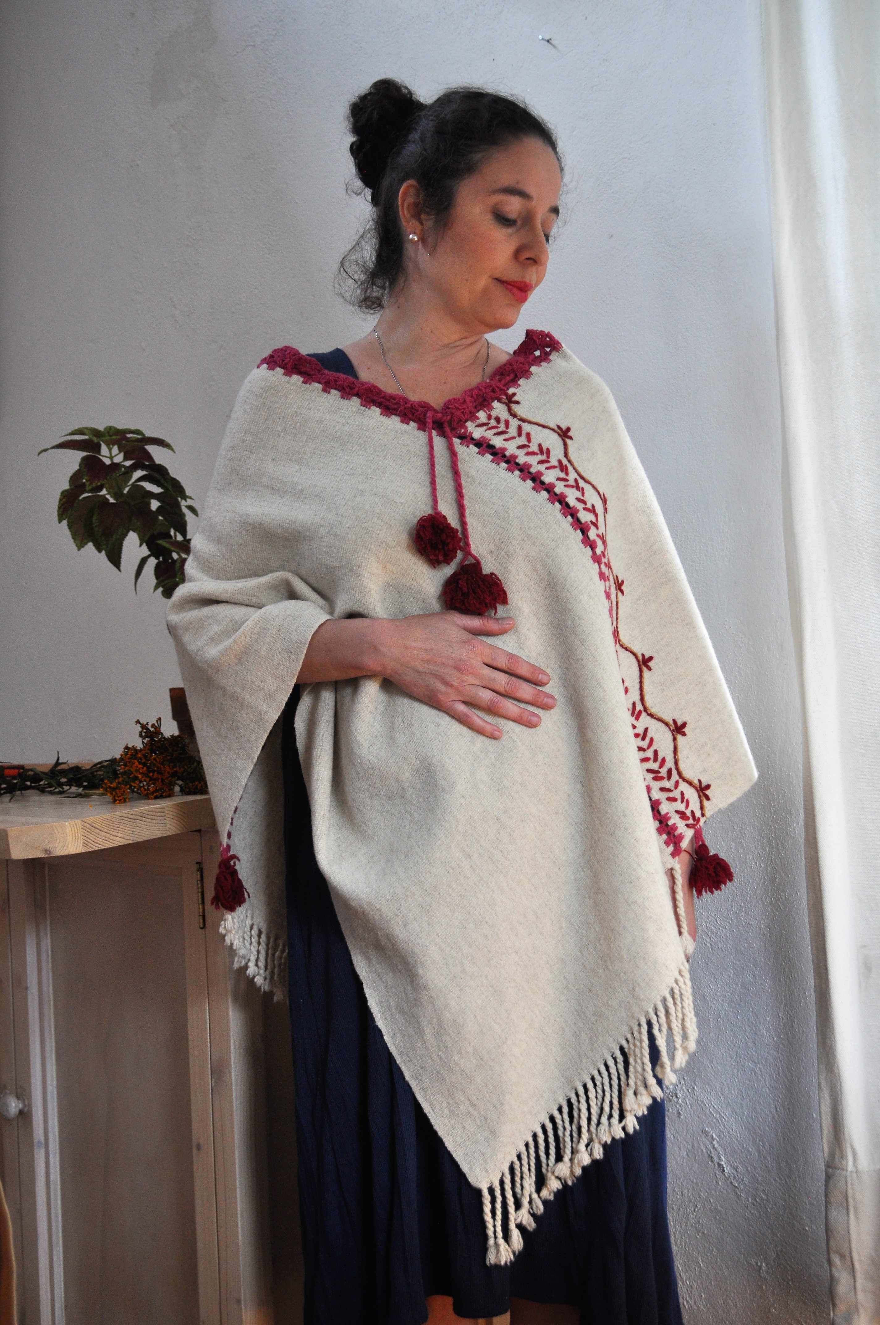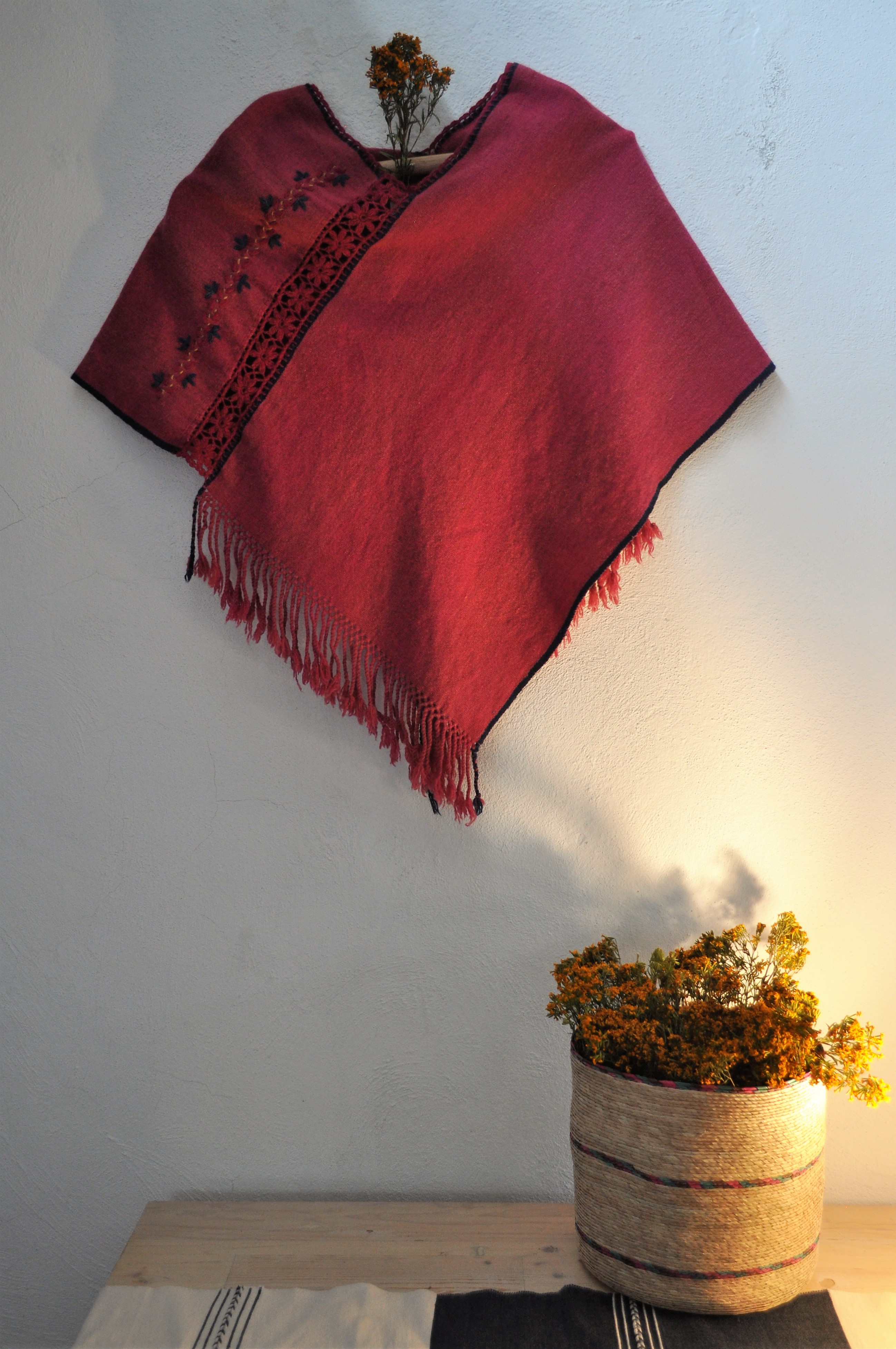 Material: Lana natural, delgada e hilos tenidos de manera natural con flores y plantas del campo, tales como el color vino de la grana cochinilla.